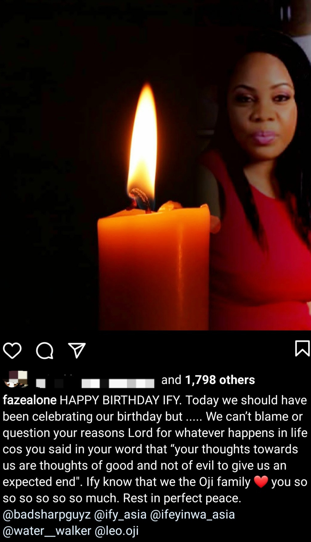 He wrote: "HAPPY BIRTHDAY IFY. Today we should have been celebrating our birthday but ..... We can’t blame or question your reasons Lord for whatever happens in life cos you said in your word that “your thoughts towards us are thoughts of good and not of evil to give us an expected end". Ify know that we the Oji family (love) you so so so so so so much. Rest in perfect peace."