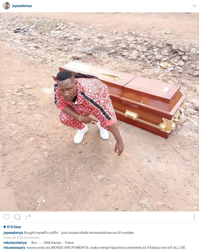 "Bought myself a coffin, just in case nikufe msisumbuliwe na till number,” he wrote.