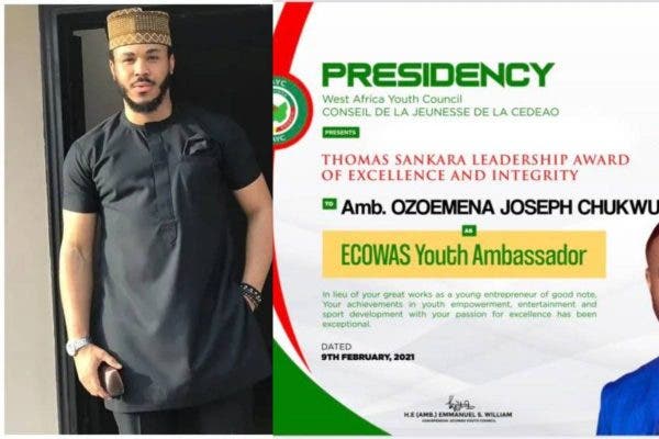 Ozo was appointed ‘ECOWAS Youth Ambassador because of his relentless crusade to promote entrepreneurship for African Youths. The former Big Brother Naija contestant also shared a photo of his official letter of appointment confirming him as an Ambassador.