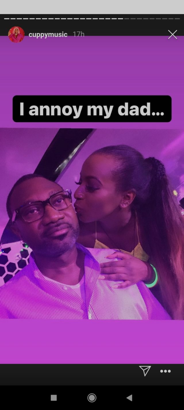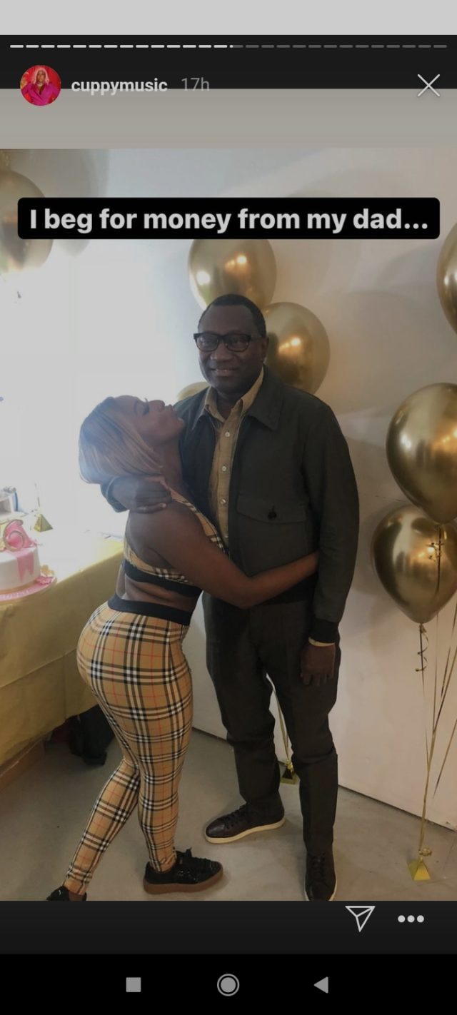 In one of the photos she shared via her Instastories, DJ Cuppy revealed she begs for money from her father. In another, she shared a photo of the two of them reading messages from guys sent to her.