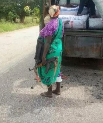 A photo of a market woman holding an AK-47 rifle protecting her goods has surfaced online leaving Nigerians in shock.