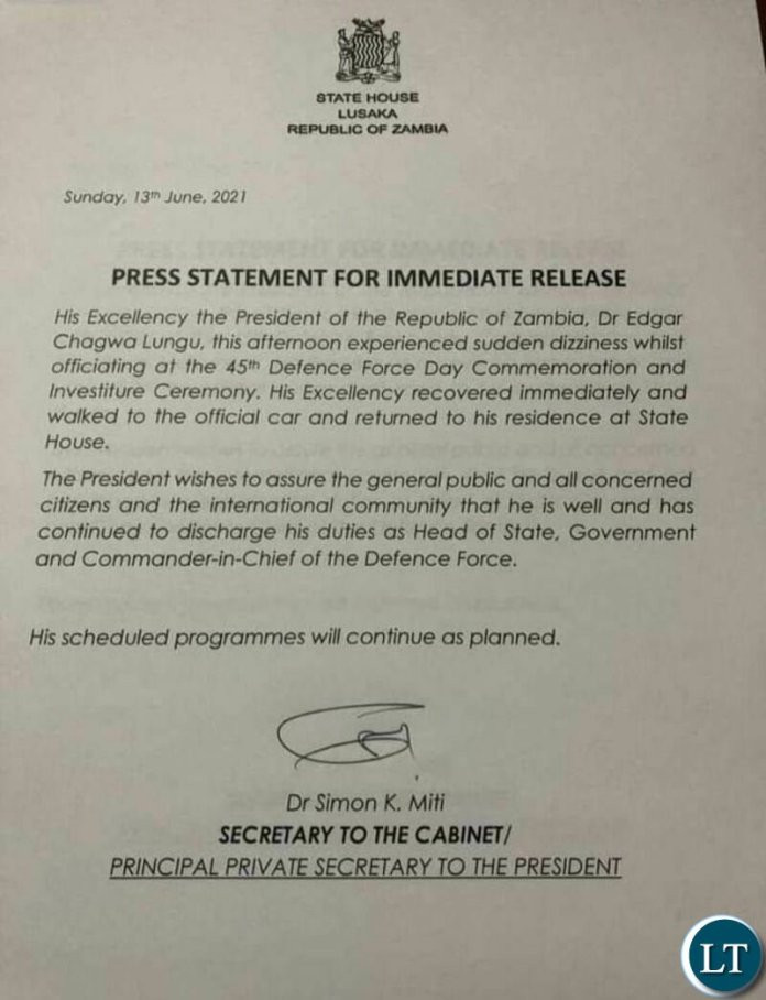The statement read, “The President of the Republic of Zambia, Dr Edgar Chagwa Lungu, this afternoon experienced sudden dizziness whilst officiating at the 45th Defence Force Day Commemoration and Investiture Ceremony.