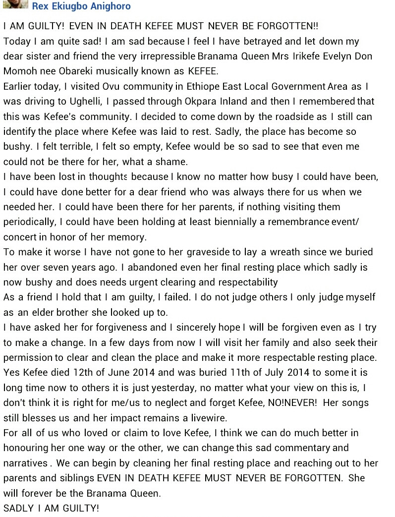 A Nigerian man identified as Rex Ekiugbo Anighoro, who happens to have been a friend of late gospel singer, Kefee Don Momoh, has blamed himself for not taking care of her graveside.
